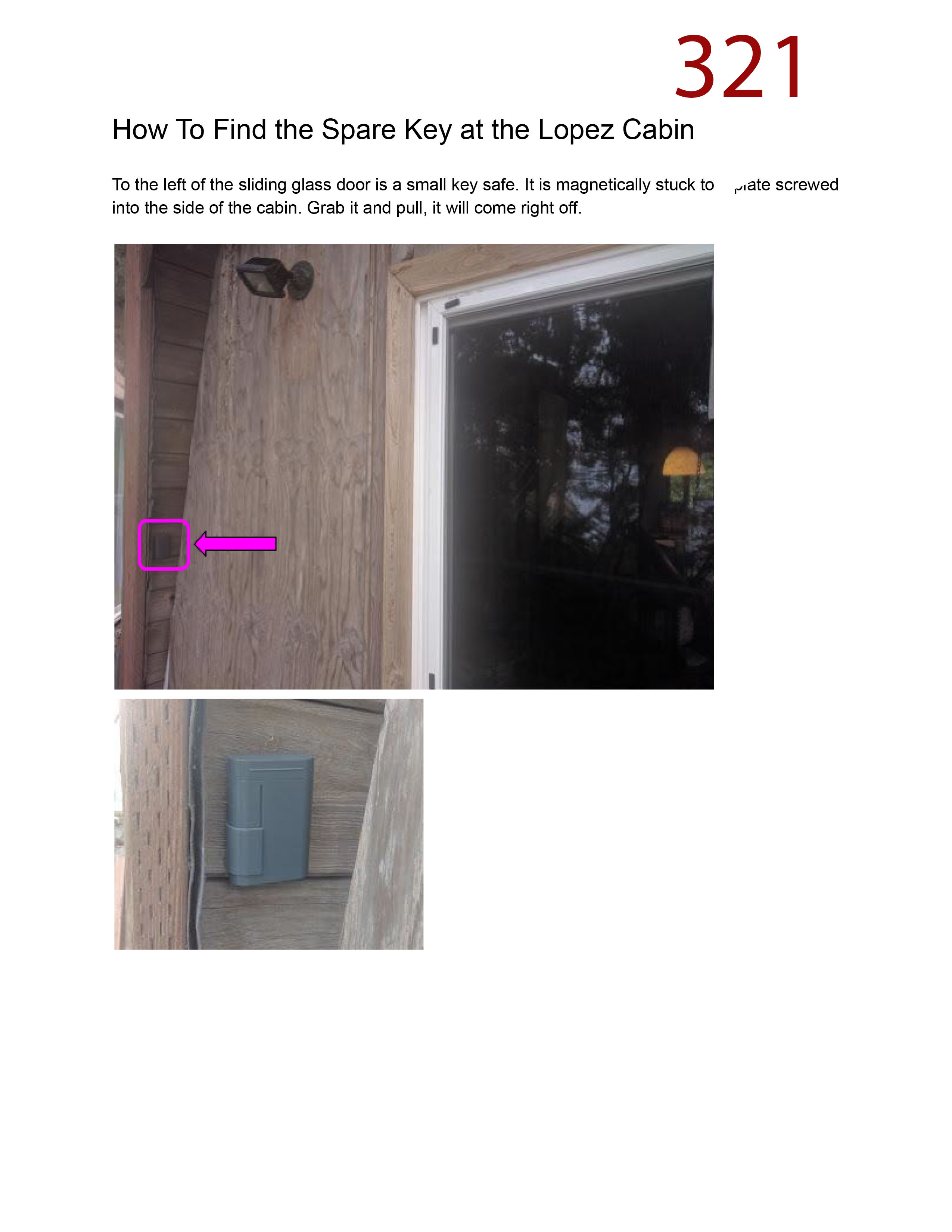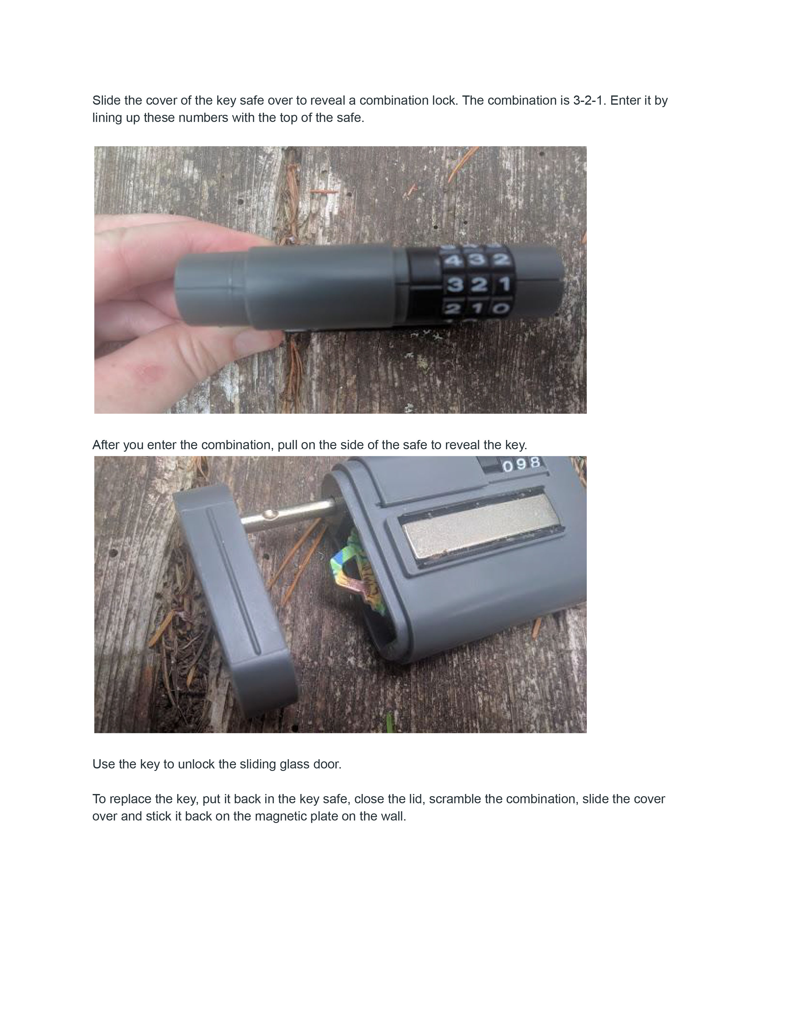 There is a key available in a lockbox to the left of the sliding glass door. Here are the links to images on to how unlock the lockbox.